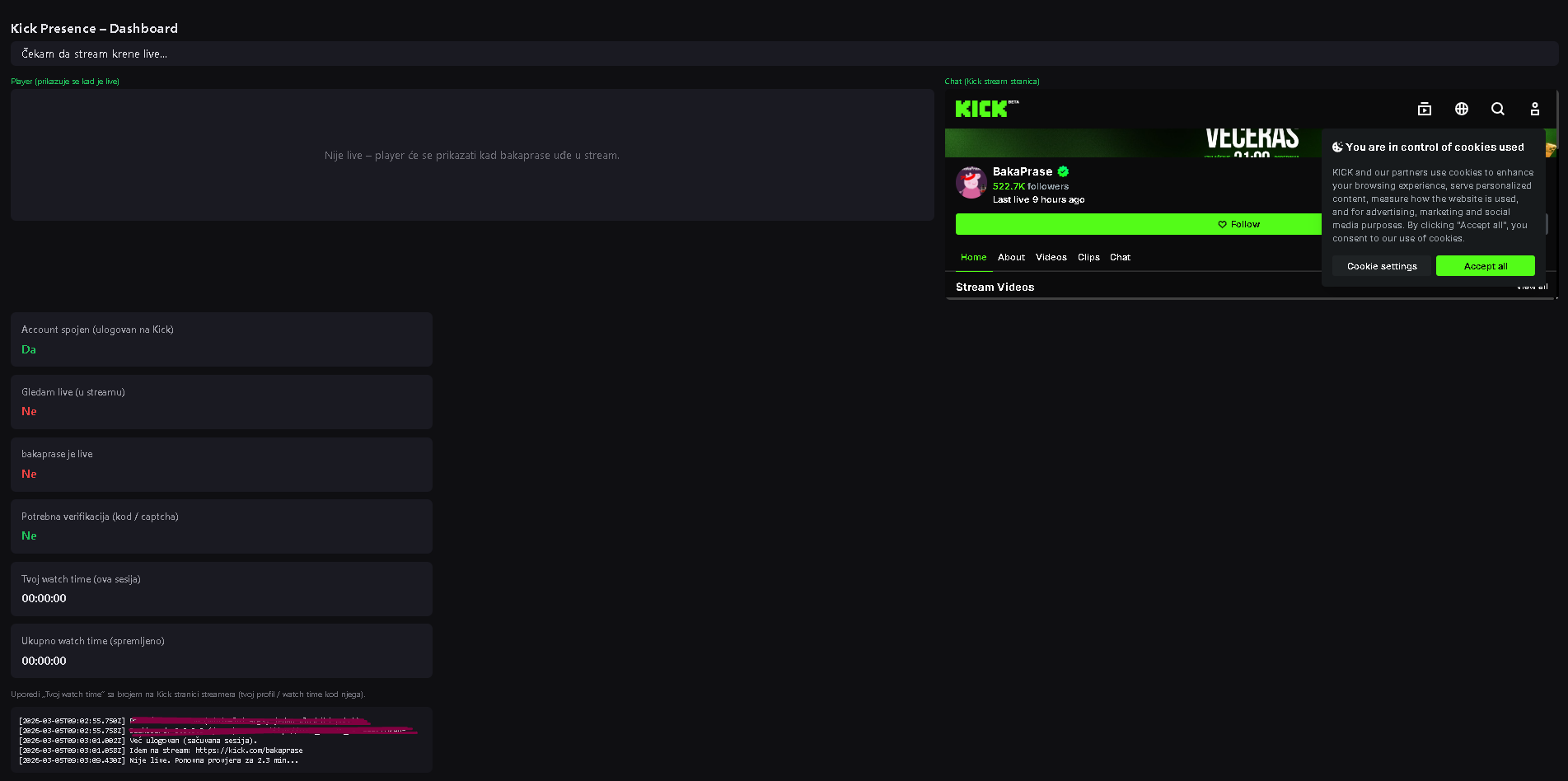 **Live detekcija:** Tri stvari: (1) Kick API (channel/livestream), glavni izvor, (2) body tekst stranice, traži "LIVE" + broj viewer-a, bez OFFLINE/Last live, (3) DOM: video readyState, LIVE badge, Watch now + Viewers. Ako stream prestane biti prepoznat, opet provjeri DOM i API, i age-gate / Watch now klik ako treba.