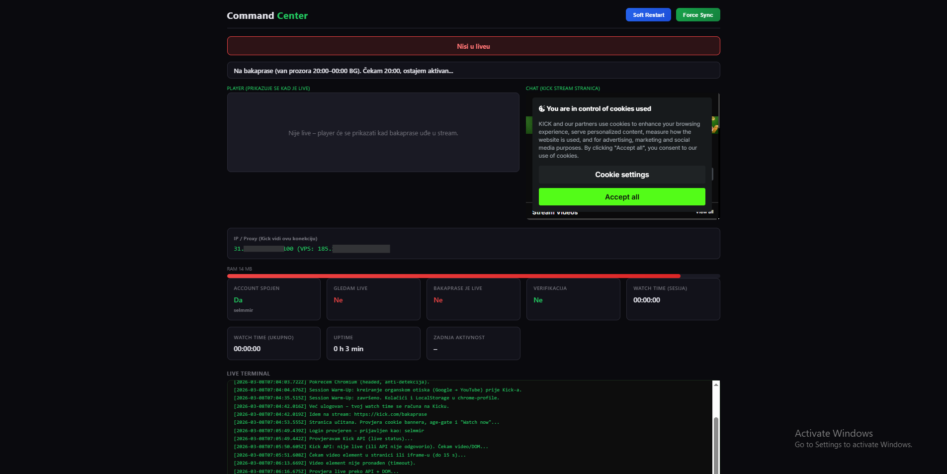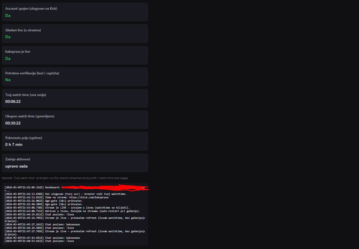 **Session Warm-Up:** WARM_UP_SESSION (default uključen): prije odlaska na Kick skripta posjeti Google (pretraga, tipicni sajtovi, skrol, klik na rezultat), pa YouTube (GDPR/cookie prihvatanje, jedan nasumičan video 10-15 s). Sve ostaje u chrome-profile; ideja je malo tzv organskog otiska prije ulazka na Kick.