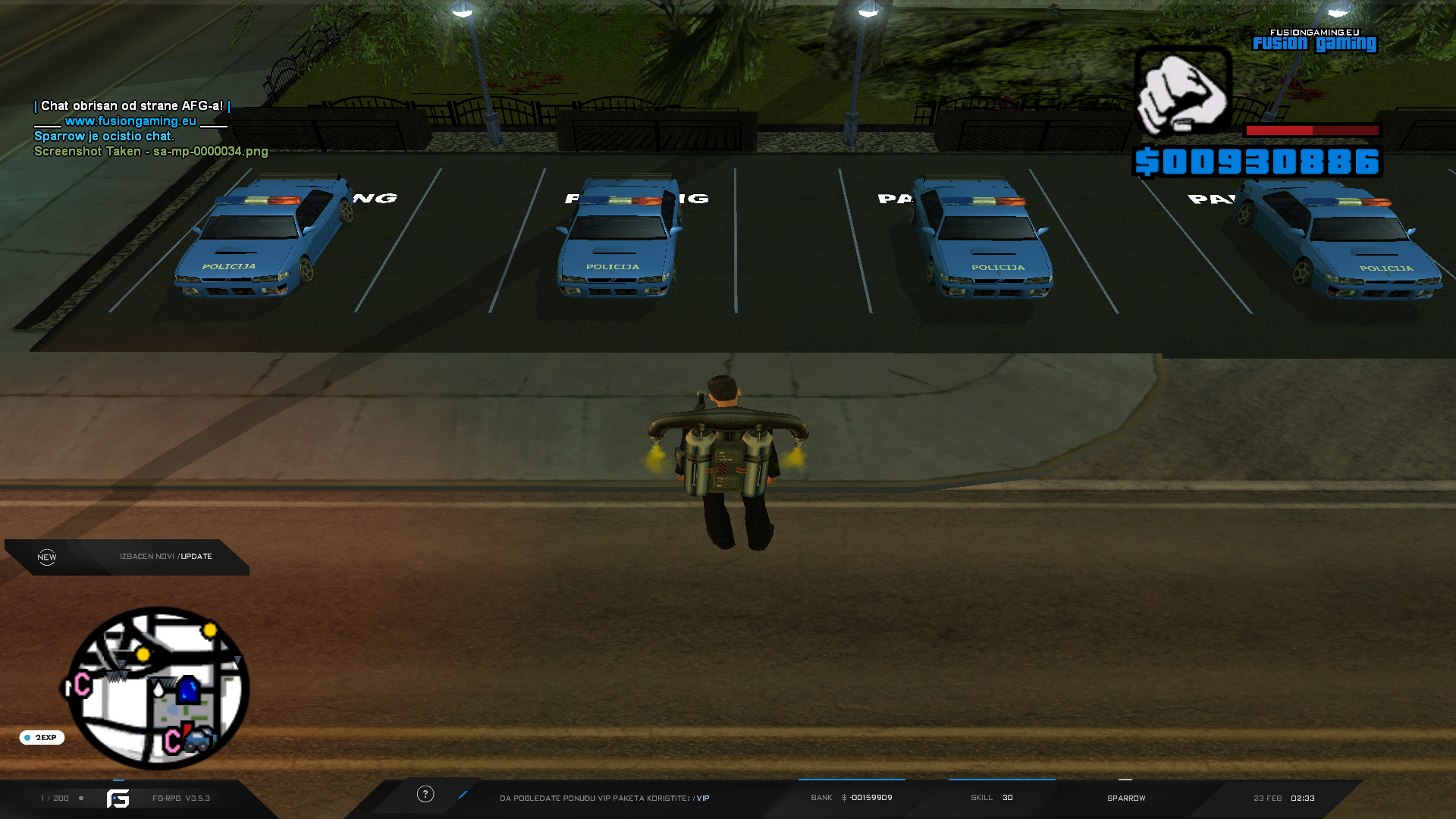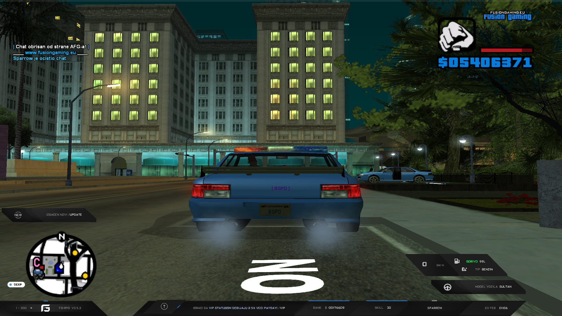 Takođe dodano ingame tuniranje org vozila što mozete vidjeti u videu od 03:38 pa nadalje, dakle sistem je prost, moguce dodavanje bilo kog objekta na auto, u videu je slučaj sa policijskim autom, dodavanje na Sultan policijske rotacije na krov, natpis policija na haubi i spojler ( cini mi se da spojler nije u videu jer sam imao nekih problema sa čuvanjem objekata ali dodat cu nakdno par slika dole ), takođe dodavanje custom tablica pri kreiranju vozila, koju skracenicu stavimo za organizaciju npr "BGPD" ta skracenica ce biti na tablicama ili primjer GSF.