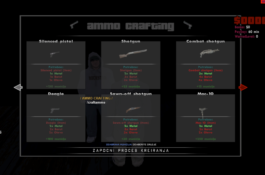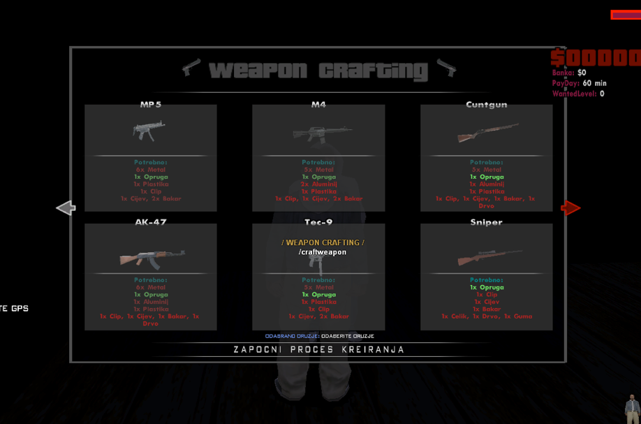 Drugi sistem koji vam predstavljamo je sistem oružja. Više niste ograničeni sa par oružja (minigun i ostalala "admin" oružja ne možete dobiti). Predstavljam vam WEAPON CRAFTING. Weapon Crafting može da koristi bilo koja osoba na serveru, međutim to zahtjeva i razne materijale koje dobivate kopanjem kontejnera. Kako bi malo otežali dostupnost oružja, odlučili smo da sakrijemo lokaciju actora te da ga sami pronađete i koristite.